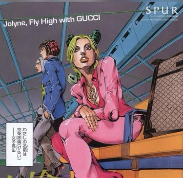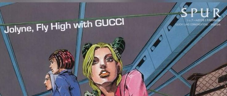 The pictures used at the forefront of this post are from one of the collaborations between GUCCI and JJBA, named 'Jolyne, Fly High with GUCCI', released in a one-shot manga by SPUR, a women's fashion magazine. They worked with the creative director of GUCCI for this, and they had previosuly worked with her before for another collaboration between the company and Hirohiko Araki (the creator of JoJo's).